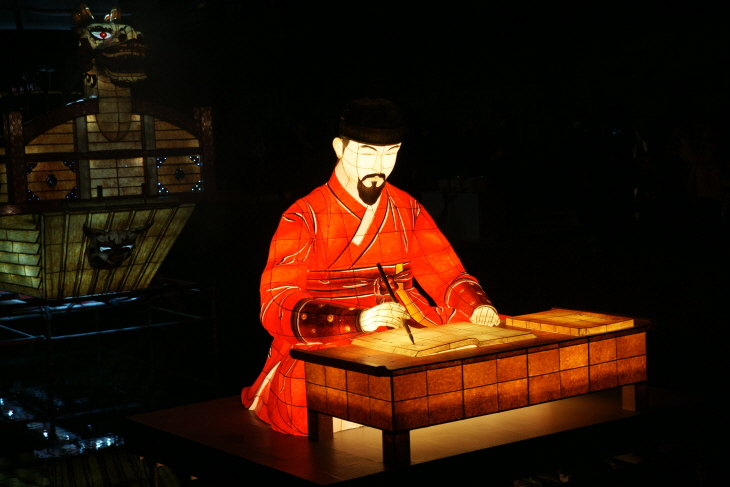 명량해전, 한산도대첩, 노량대첩 등 무수한 전투에서 승리한 이순신 장군은 임진왜란 당시 전장에서 난중일기를 썼다. 일기 형식이지만 전장에서의 기록과 함께 문학적, 역사적 가치를 인정받아 2013년 세계기록유산에 등재됐다. 한 치의 흐트러짐 없이 정좌로 일기를 쓰는 이순신 장군과 입에서 흰 연기를 내뿜으며 장군을 호위하는 거북선은 비장함이 느껴진다.