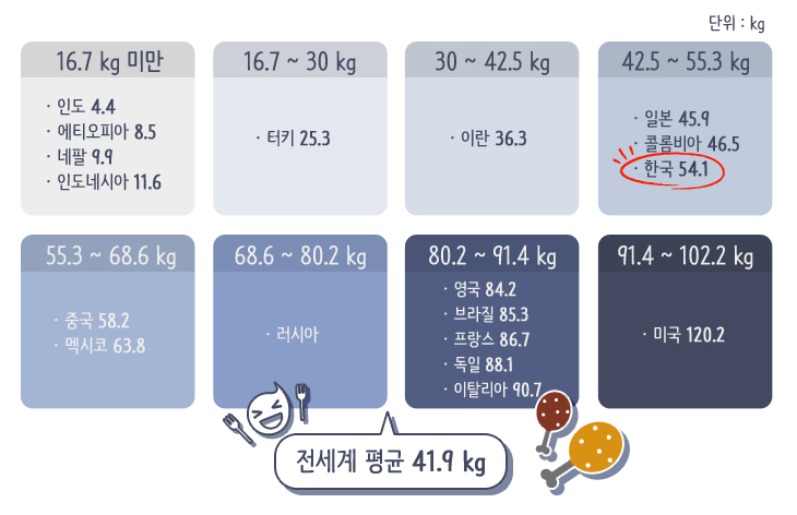 매일같이 새로운 먹거리가 쏟아져 나오고 있는 가운데서도 꾸준하고도 압도적인 인기를 누리고 있는 식재료가 있으니, 바로 고기이다. 고기가 귀하다는 것도 옛말. 소득 수준이 높아질수록 육류 품목에 대한 소비량도 높으며, 회식을 비롯한 모임 자리에서도 가장 높은 선호도를 보이는 것은 역시 육류이다. 우리나라의 육류 연간 소비량도 1인 당 54.1kg에 달하고 있으니, 우리가 알게 모르게 일상 속에서 얼마나 많은 육류를 소비하고 있는지 짐작해 볼 수 있을 것이다.