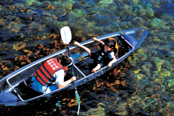 투명카누를 탄 모자가 신기한 듯 바닷속 풍경을 감상하고 있다.2