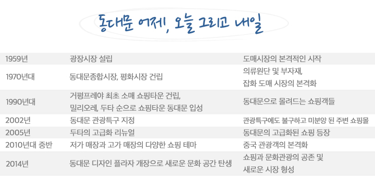요즘 동대문을 가면 한국인보다 외국인을 더 많이 볼 수 있다. 요즘 사람들은 ‘동대문’하면 어떤 이미지가 떠오를까? 예전엔 원단 및 부자재를 파는 종합시장 쪽과 다양하고 싼 옷들이 모여 있는 대형 쇼핑타운을 떠올렸을 테지만 지금의 동대문은 한두 가지로 이미지가 나뉘어 설명되거나 떠올려 지지는 않는 듯하다. 옛 운동장의 자리엔 먼 미래에서 온 듯한 디자인플라자, 그 맞은편엔 관광객으로 북적이는 대형 쇼핑타운, 거기서 조금만 옆으로 가면 각종 잡화와 의류 원단 및 부자재를 파는 전문 도매 상가까지 이제 동대문은 도매시장으로도 아니고, 쇼핑거리만도 아닌 종합 문화공간으로 바뀌어 가고 있다.