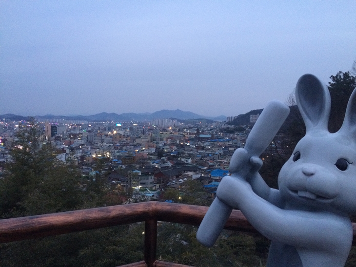 전망대를 지키는 절구와 토끼. 달빛과 어스름 내린 순천 시내 전경이 한참 동안 머물게 한다.