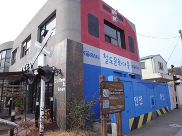 순천 조곡동 철도관사마을 입구 안내소 역할을 하는 카페 '기적소리'. 벽면의 열차 벽화가 눈에 띈다.