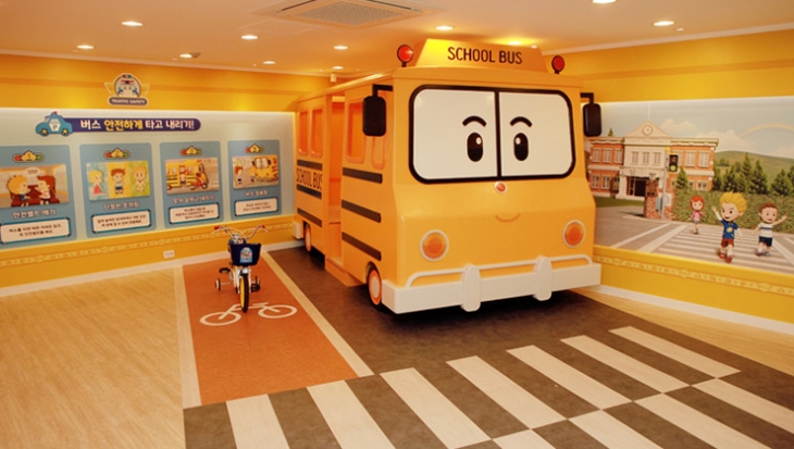 그 앞에 세워진 건물은 교통공원의 양대 콘텐츠 중 하나인 어린이 교통안전교육관. 벽면에는 캐릭터들이 설명해주는 교통안전 패널이 다양한 안전수칙을 효과적으로 전달하고 있다. 한쪽 구석에는 암실체험 코너를 설치해 어두운 날씨에 어떤 옷을 입어야 하는지 직관적으로 이해할 수 있도록 도왔다. 그러나 1층에서 가장 눈에 띄는 것은 뭐니 뭐니 해도 샛노란 미니 스쿨버스인 스쿨비 모형. 아이들이 직접 타러 올라갈 수 있는 사이즈로 제작한 스쿨비 옆에는 버스를 안전하게 타고 내릴 수 있는 방법을 설명했다. 도로모양의 자석붙이기 놀이에는 다양한 폴리 캐릭터들이 있어 아이들의 발길을 붙들곤 한다.