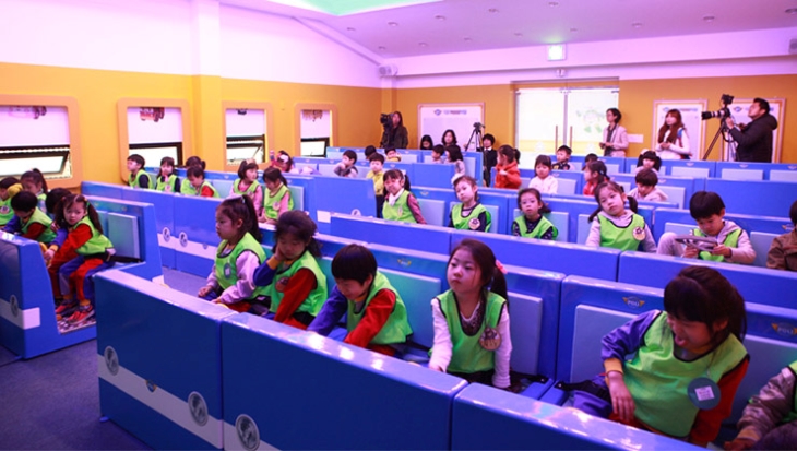 운전석처럼 꾸며진 좌석에 앉아 아이들이 교육에 집중하고 있다.